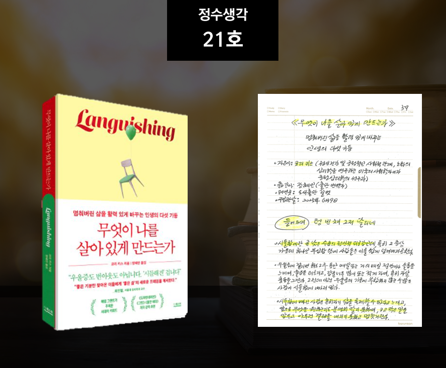 | “뭐지, 이 잔잔한 우울감은?” “특별히 우울하거나 불안하지도 않은데 사는 것 같지도 않아. 의욕도 기대도 없어.” 이런 기분을 느껴봤거나, 이러한 상태에서 벗어나고 싶다면 <무엇이 나를 살아 있게 만드는가> 이 책을 권합니다. 저자는 이 상태를 ‘시들함’으로 명명하고, 시들함에 빠진 대다수 현대인들이 ‘활력’있는 삶으로 옮겨가야 한다고 주장합니다. 활력을 위해서는 배움, 관계, 영성, 목적, 그리고 놀이가 필요하다고 합니다. 스스로 ‘활력’이 필요하다고 느꼈다면 이 책을 보면서 확인해 보셔도 좋습니다. -<정수생각>- 상세보기→ |
