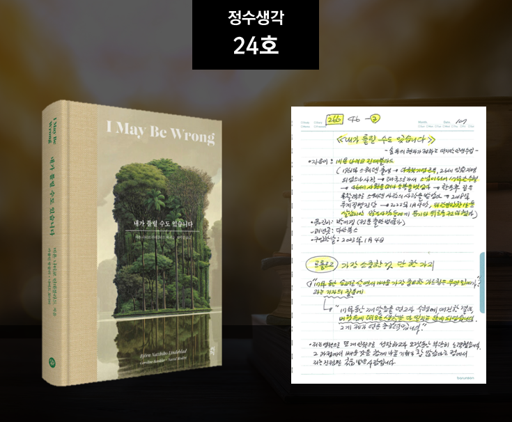 | [내가 틀릴 수도 있습니다] 이 책에는 다국적 기업의 임원, 태국에서 17년간의 스님, 환속, 그리고 젊은 나이에 루게닉병으로 세상을 떠난 한 인간의 내면의 울림이 가감없이 드러나 있습니다. 저자는 ”삶 속에서 결정을 내리고 어떻게 살아가야 할지 고민 할 때도 언젠가는 이 모든 것이 끝난다는 것을 늘 명심하기 바랍니다. 인생은 짧습니다.“라고 말하면서 항상 이 말을 명심하라고 부탁합니다. “내가 틀릴 수도 있습니다. 내가 틀릴 수도 있습니다. 내가 틀릴 수도 있습니다.” -<정수생각>- 상세보기→ |