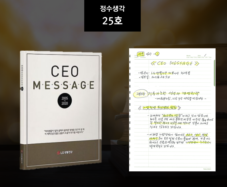 | 다사다난했던 25년을 보내면서 주위에 힘들었다는 분들이 많은 것 같습니다. LG생활건강 전 차석용 대표이사는 17년 연속 성장, 매출 8배 성장, 그리고 영업이익을 23배 성장시킨 전설적인 경영인입니다. 회사를 크게 성장시킨 힘의 원천이 어디서 나왔는지 알아보는 의미에서 2005년부터 2020년까지 정기적으로 작성해 임직원들에게 보낸 <>를 다시 공유합니다. 한해를 보내면서 이 메시지에 어떤 내용이 담겨 있는지 살펴보고, 26년 새해 경영전략에 조그만 실마리라도 될 수 있었으면 합니다. -<정수생각>- 상세보기→ |